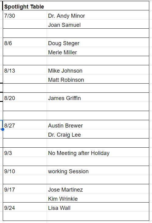 Each member listed above will have 3 minutes to present their business infomercial on the dates mentioned.